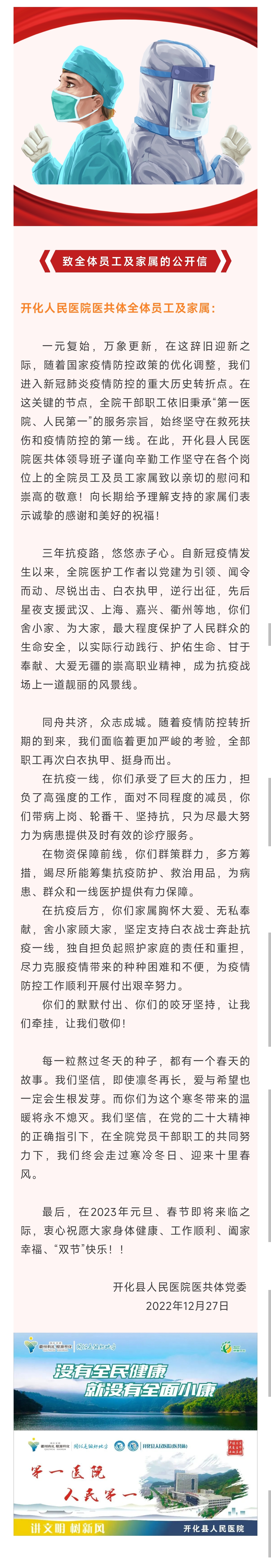 【医院动态】开化县人民医院医共体致全体员工及家属的公开信 文章来源: 作者: 点击数:2587 更新时间:2023-01-11 上一篇: 招聘食堂阿姨的公告 下一篇: 【医院动态】开化县人民医院医共体2022年新员工岗前培训顺利举办