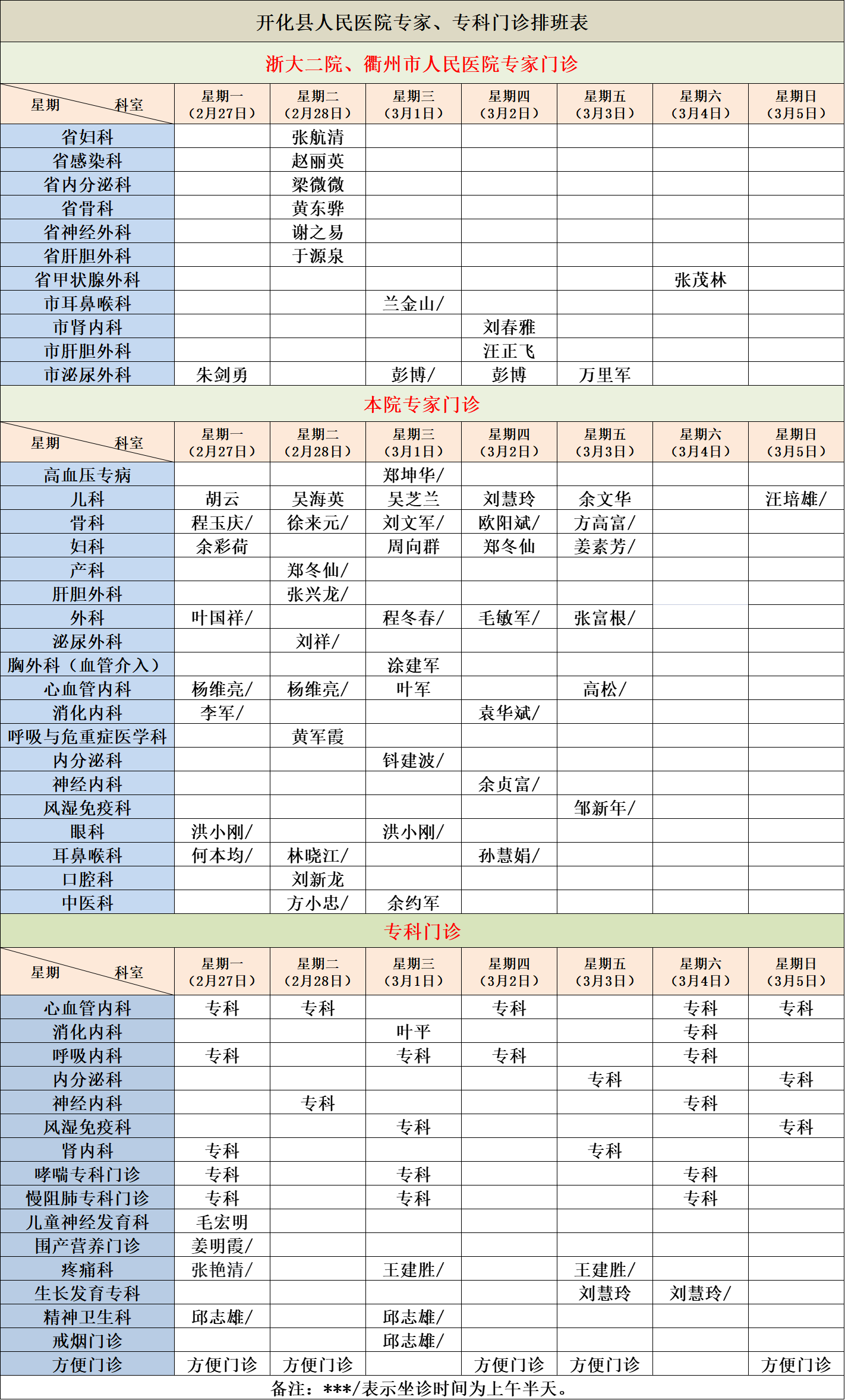 医讯 | (2月27日—3月5日)开化县人民医院专家大咖坐诊安排! 文章来源: 作者: 点击数:2497 更新时间:2023-02-27 上一篇: 招聘食堂阿姨的公告 下一篇: 医讯 | (2月20日—2月26日)开化县人民医院专家大咖坐诊安排!