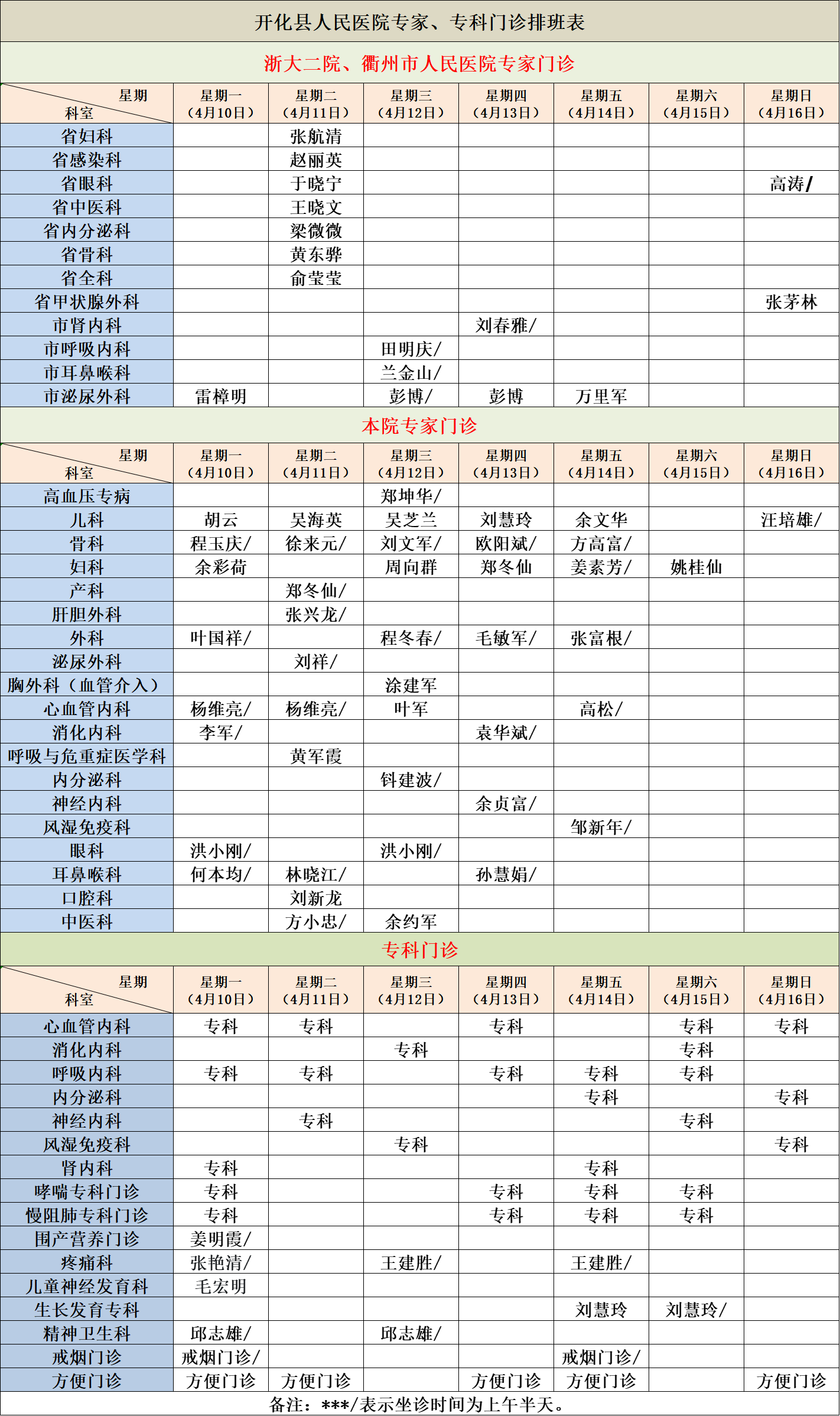 医讯 | (4月10日—4月16日)开化县人民医院专家大咖坐诊安排! 文章来源: 作者: 点击数:2603 更新时间:2023-04-08 上一篇: 招聘食堂阿姨的公告 下一篇: 医讯 | (4月3日—4月9日)开化县人民医院专家大咖坐诊安排!