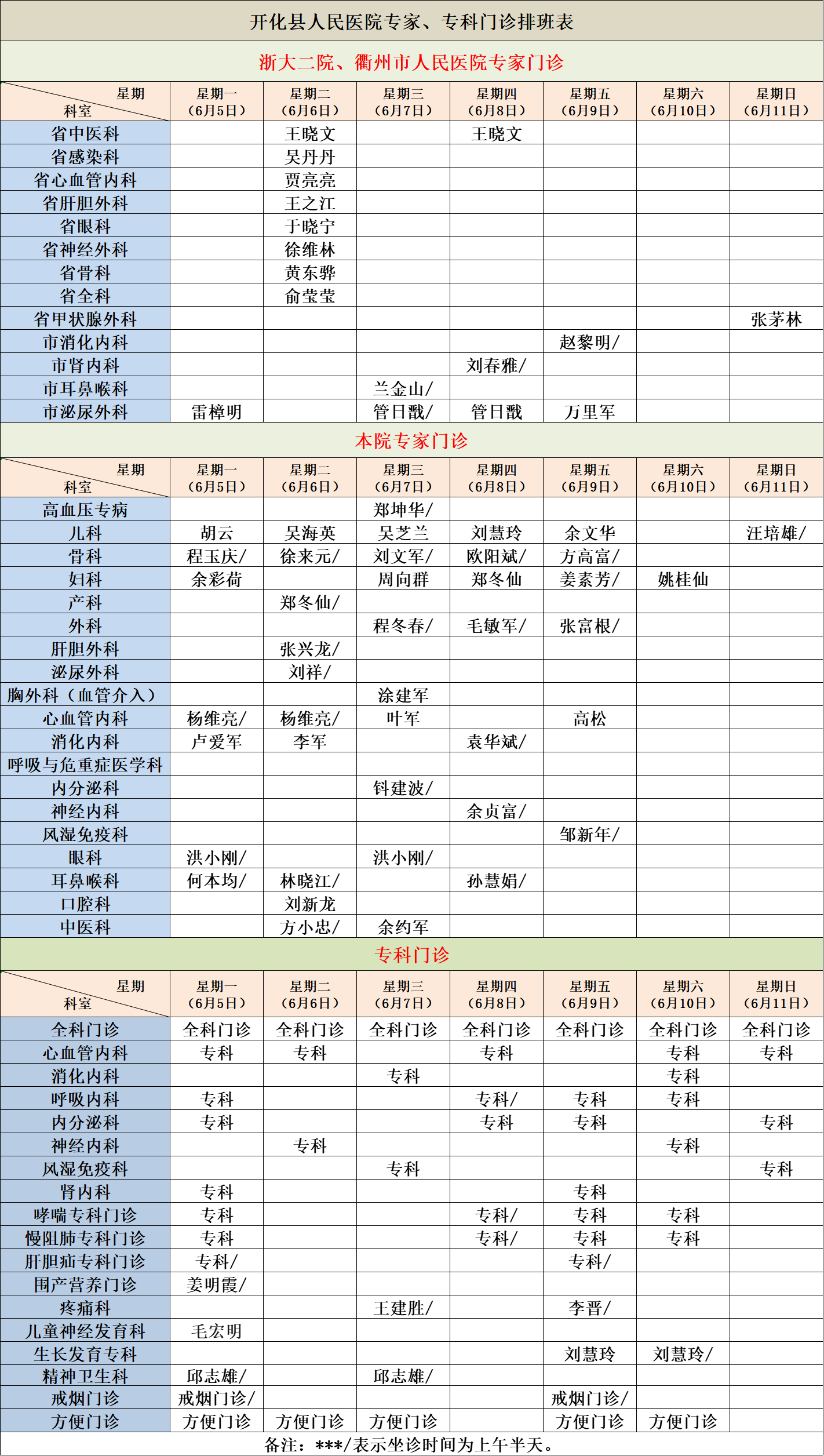 医讯 | (6月5日—6月11日)开化县人民医院专家大咖坐诊安排! 文章来源: 作者: 点击数:2492 更新时间:2023-06-05 上一篇: 招聘食堂阿姨的公告 下一篇: 【医院动态】开化县人民医院内一科小课堂开课啦!