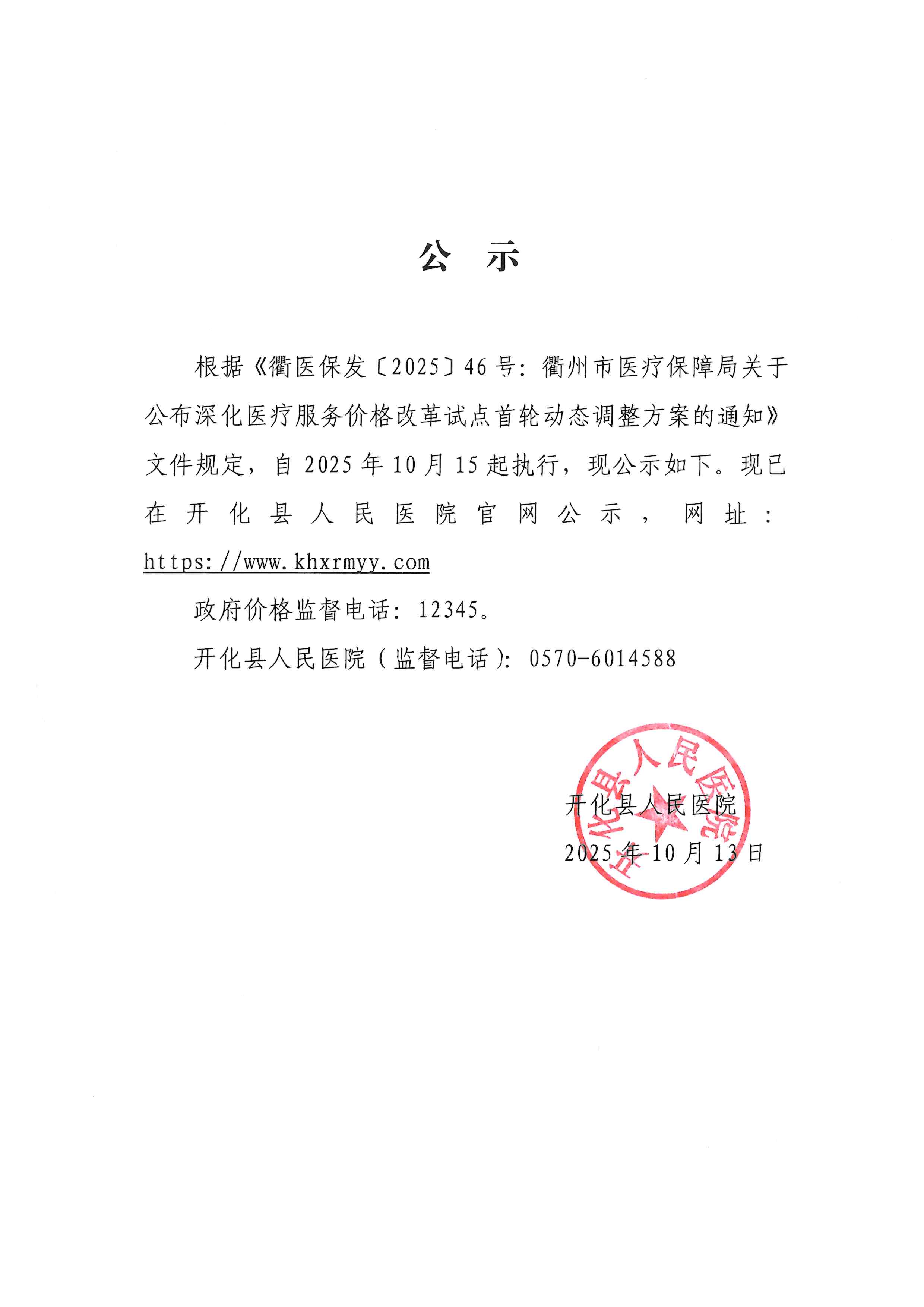 关于《衢医保发〔2025〕46号衢州市医疗保障局关于公布深化医疗服务价格改革试点首轮动态调整方案的通知》的公示 文章来源: 作者: 点击数:379 更新时间:2025-10-15 附件:衢医保发〔2025〕46号衢州市医疗保障局关于公布深化医疗服务价格改革试点首轮动态调整方案的通知 上一篇: 关于《衢医保发〔2025〕47号衢州市医疗保障局关于公布产科、护理等2类医疗服务价格项目和医保支付政策及脑机接口相关医疗服务价格项目的通知》的公示1 下一篇: 开化县人民医院关于新增特需门诊服务收费标准的公示