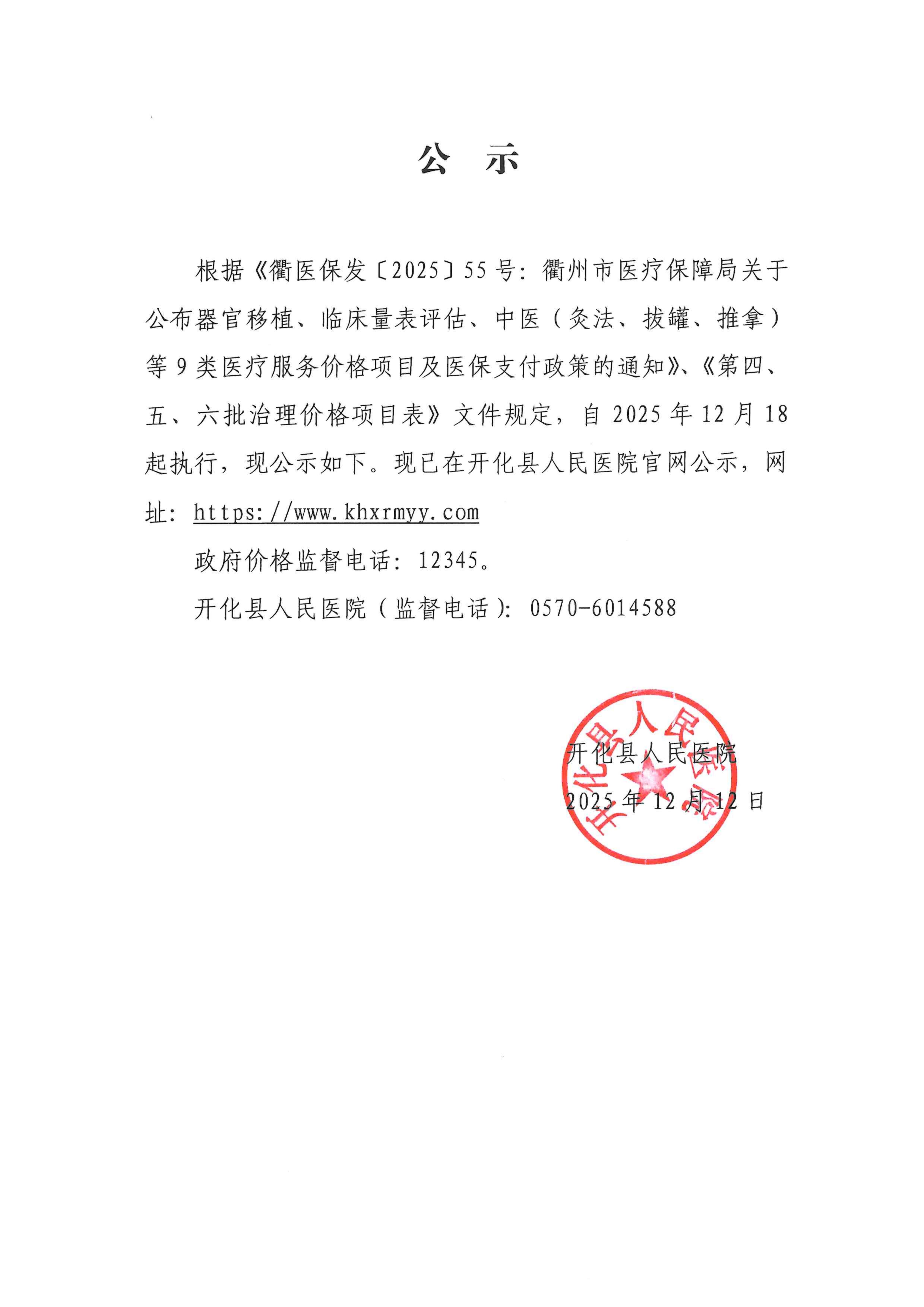 关于《衢医保发〔2025〕55号衢州市医疗保障局关于公布器官移植、临床量表评估、中医(灸法、拔罐、推拿)等9类医疗服务价格项目及医保支付政策的通知》等文件.. 文章来源: 作者: 点击数:2235 更新时间:2025-12-12 衢医保发〔2025〕55号衢州市医疗保障局关于公布器官移植、临床量表评估、中医(灸法、拔罐、推拿)等9类医疗服务价格项目及医保支付政策的通知 第四、五、六批治理价格项目表 上一篇: 开化县人民医院关于新增中药面膜特需服务收费标准的公示 下一篇: 开化县人民医院关于保健膏方门诊及膏方煎制医疗服务项目收费公示