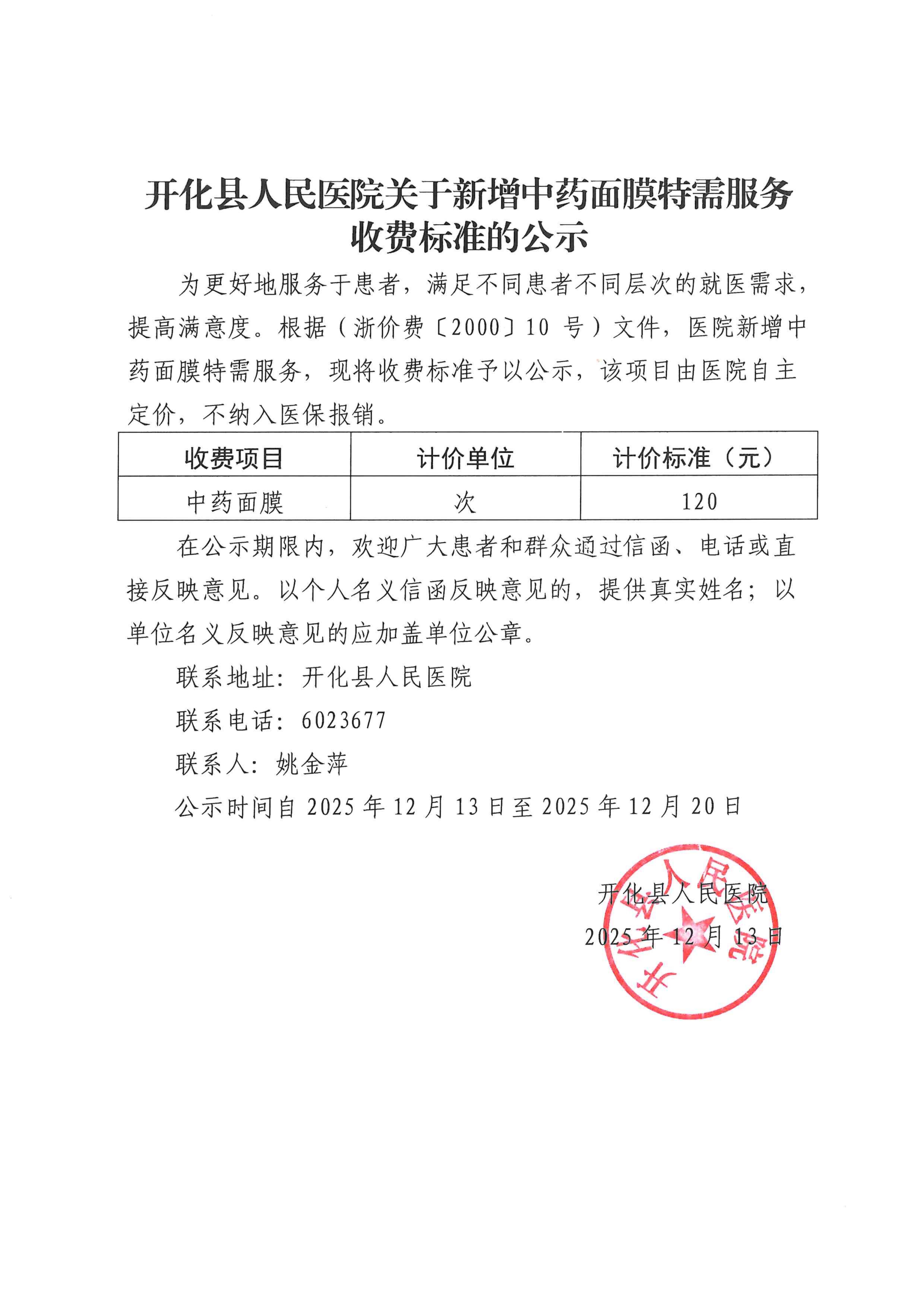 开化县人民医院关于新增中药面膜特需服务收费标准的公示 文章来源: 作者: 点击数:159 更新时间:2025-12-13 上一篇: 开化县人民医院关于盆底康复治疗医疗服务项目收费公示 下一篇: 关于《衢医保发〔2025〕55号衢州市医疗保障局关于公布器官移植、临床量表评估、中医(灸法、拔罐、推拿)等9类医疗服务价格项目及医保支付政策的通知》等文件..