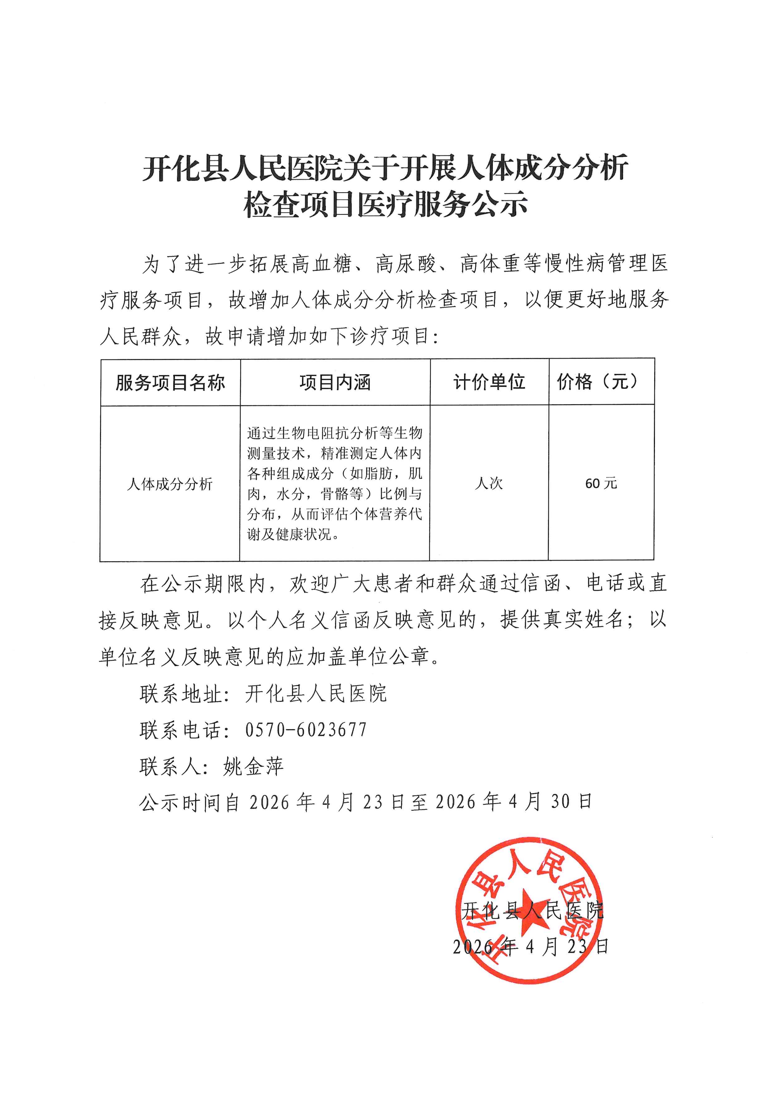 开化县人民医院关于开展人体成分分析检查项目医疗服务公示 文章来源: 作者: 点击数:43 更新时间:2026-04-23 上一篇: 到顶了... 下一篇: 开化县人民医院关于妇产科产后照护病房医疗服务项目收费公示